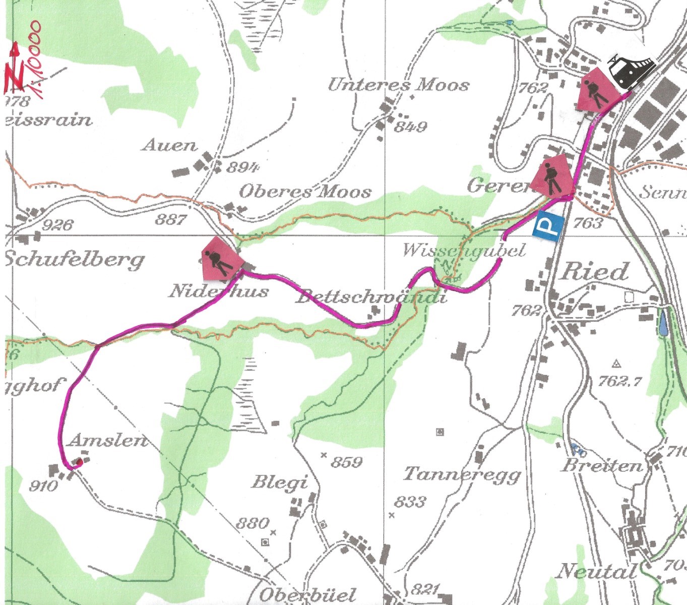 1. Wegweiser beim Bahnhof/ 2. Wegweiser beim TCS-Parkplatz/ 3. Wegweiser Käserei Niederhaus.